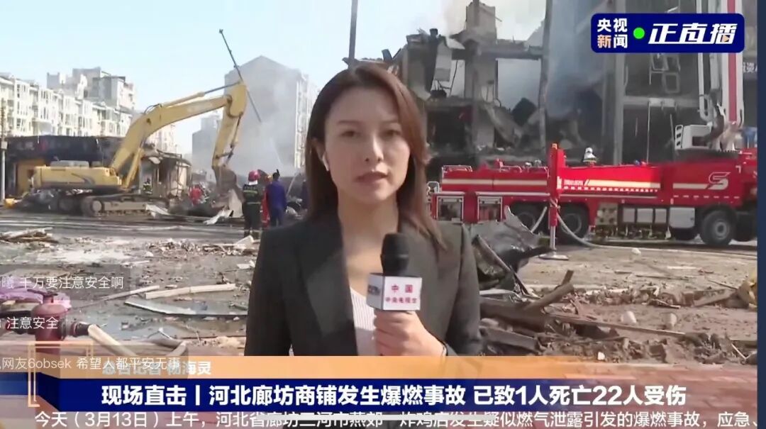 △记者杨海灵直播报道河北燕郊爆燃事故。