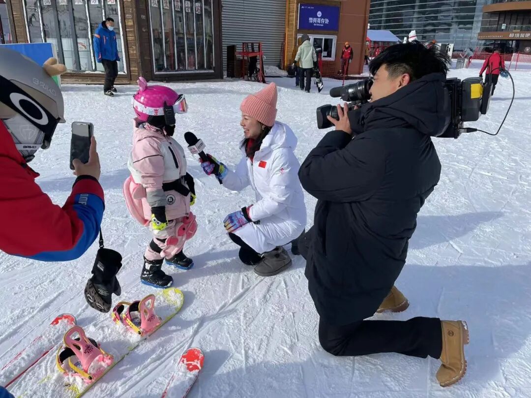 △记者杨海灵在河北崇礼采访冬奥会带来全民“冰雪热”。