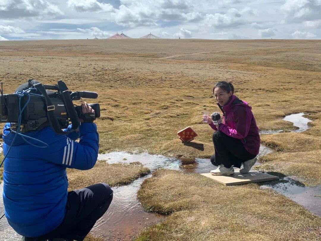 △记者杨海灵在黄河源头约古宗列曲现场直播。