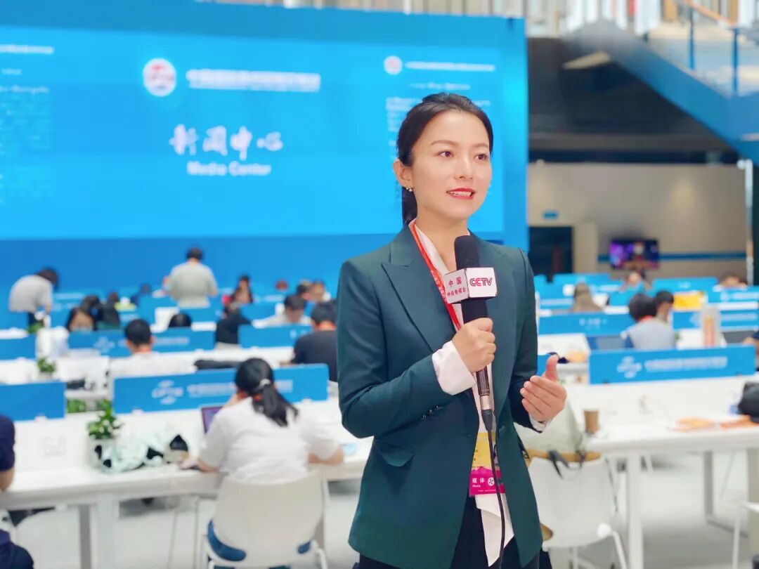 △记者杨海灵在北京服贸会新闻中心现场直播。