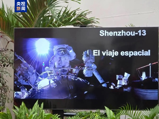 △活动现场播放中国首部8K太空纪录电影《窗外是蓝星》西班牙语版宣传片